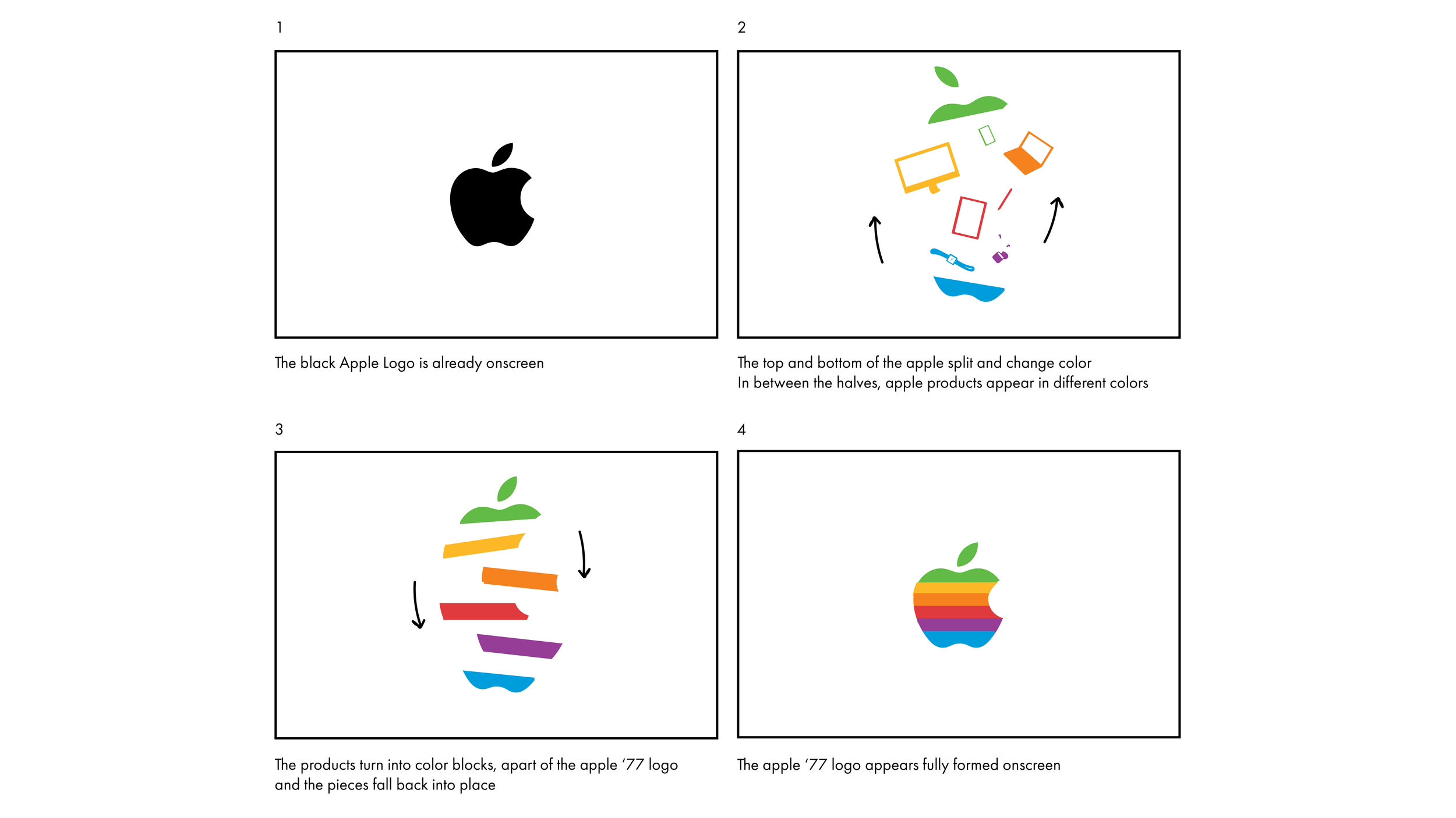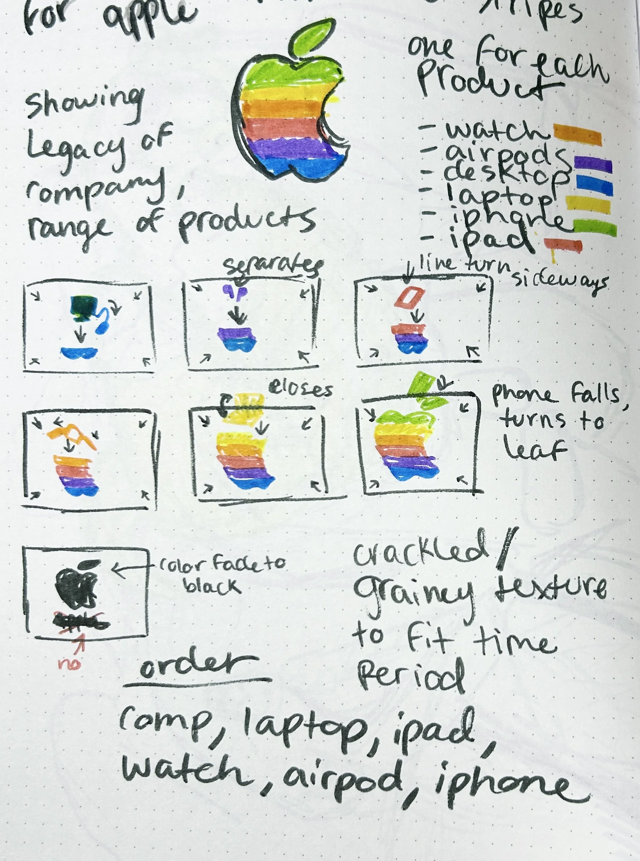The goal of the project was to encapsulate the chosen brand in exactly 5 seconds. For my concept, I wanted to show the past and present of Apple. Early on, I correlated the 1970’s logo colors to correspond with a current apple product.